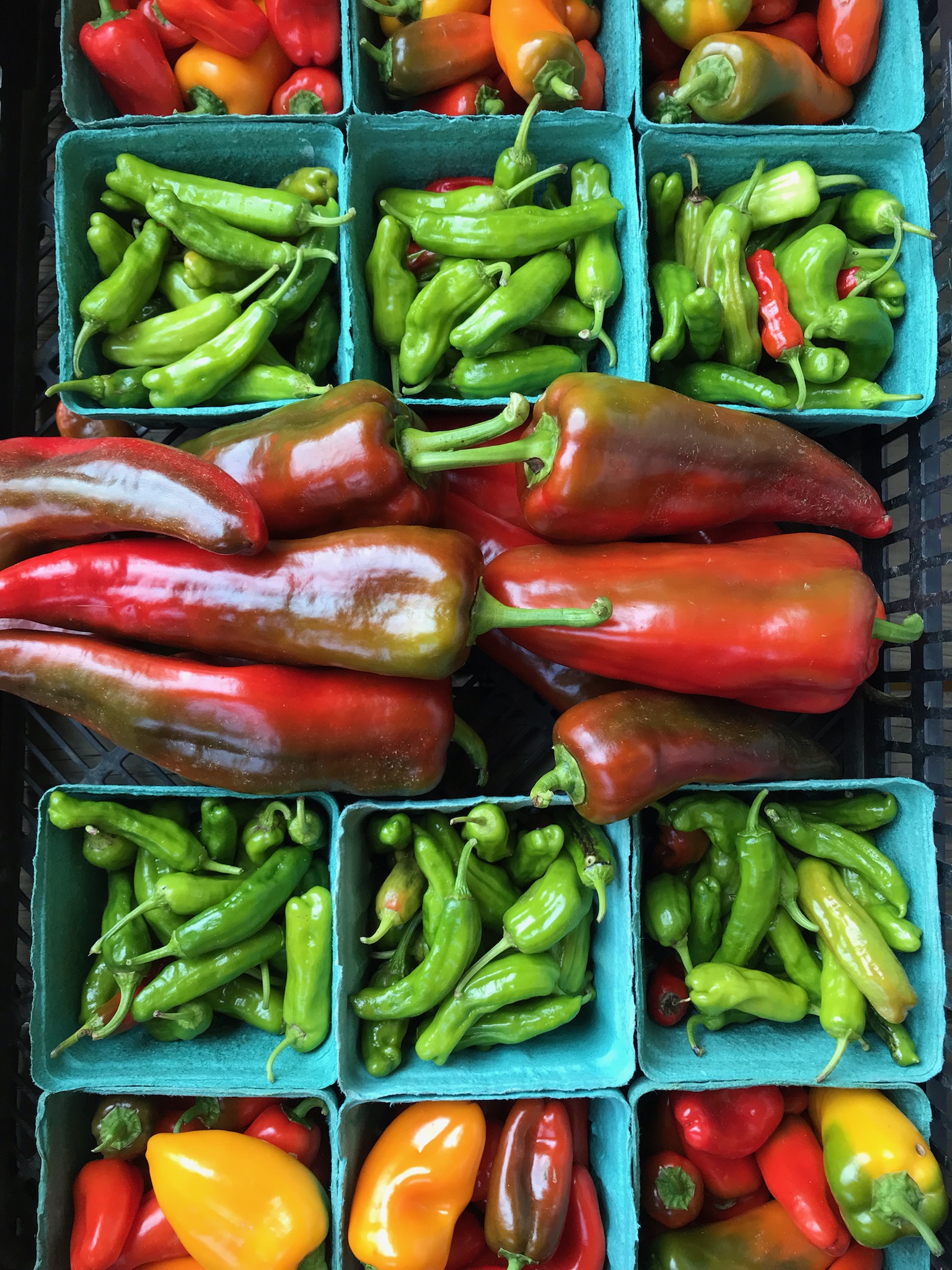 August: eggplant, sweet peppers, cucumbers, shishito peppers, heirloom tomato, carrots