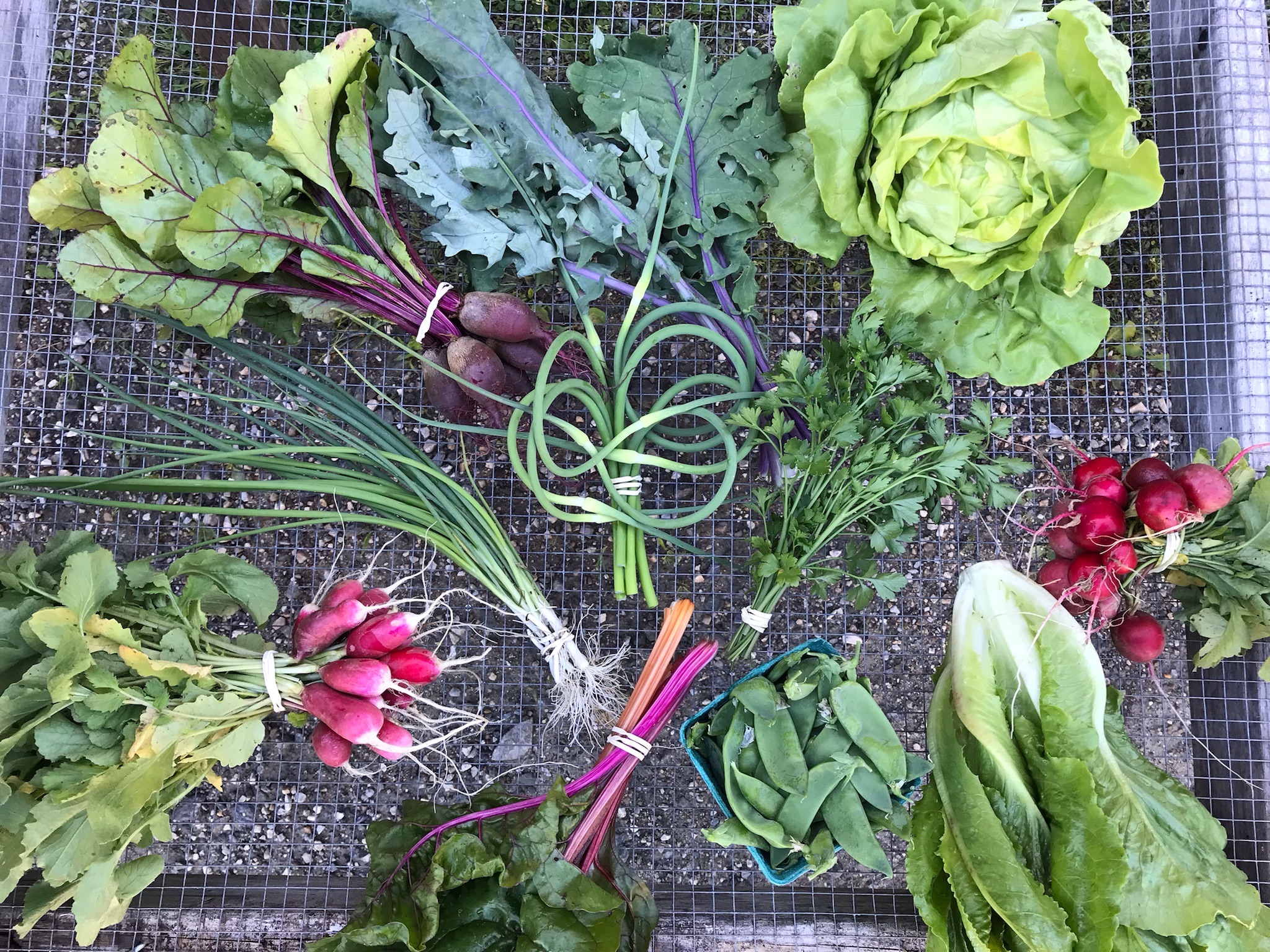 June: butterhead lettuce, radishes, scallions, mustard greens, sugar snap peas